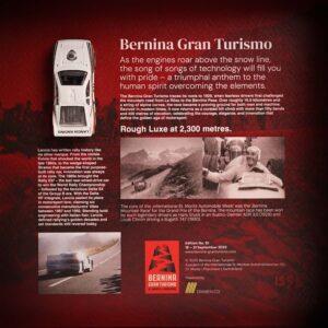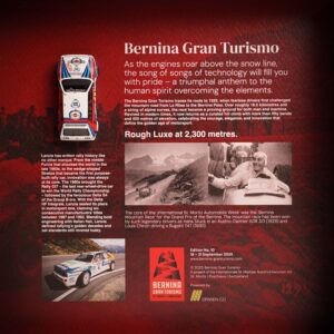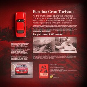 This art frame celebrates the elegance and racing spirit of Alfa Romeo, showcasing the Giulia Sprint in a Bernina Gran Turismo Special Edition. The composition highlights the coupe’s flowing lines and racing stance, paired with bold graphic accents that echo the alpine road and the historic motorsport stage of the Bernina Pass.